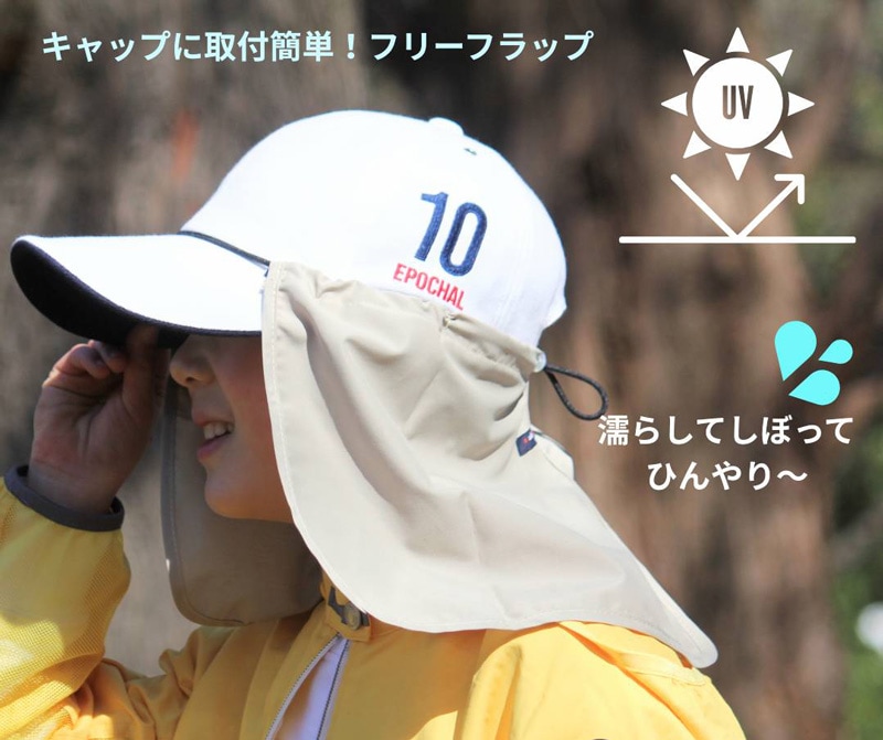 ベースボールキャップやワークキャップなど、前だけにつばの付いた帽子にワンタッチで取付け可能なフリーフラップです。
