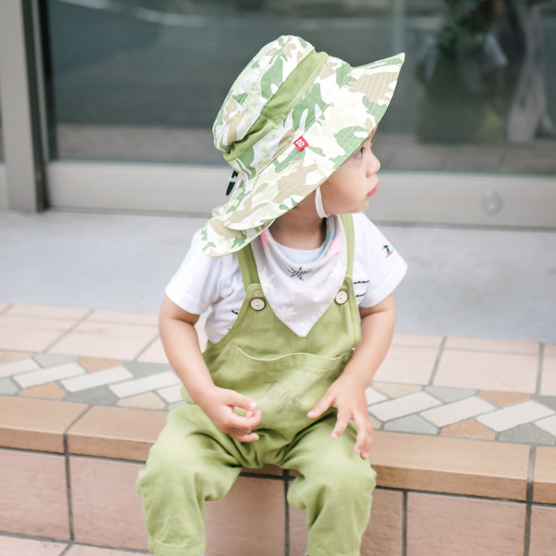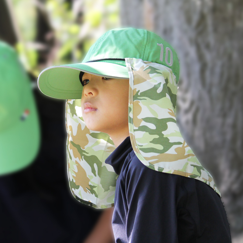 キッズ用サンシェード(フラップ)付き帽子:お子様の繊細な肌を守る安心設計。軽量で、自宅でお洗濯できるので毎日清潔に。